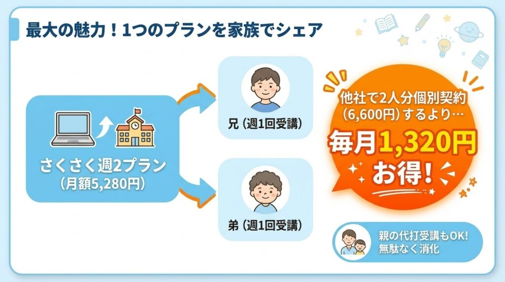 具体的にどれくらいお得になるか、数字を出して説明しますね。例えば、兄弟2人で週1回ずつマンツーマンのレッスンを受けさせたいとします。一般的なオンライン英会話なら2人分の月額料金(約6,600円)がかかります。しかし、リップルキッズパークなら「さくさく週2プラン(月額5,280円)」を1つ契約して、兄弟でアカウント共有(シェア)するだけで済みます。これだけで、毎月1,320円、年間で15,000円以上の節約になります。もし子供が急にレッスンを受けられなくなっても、親が代打で受講できるので回数を無駄にすることもありません。
