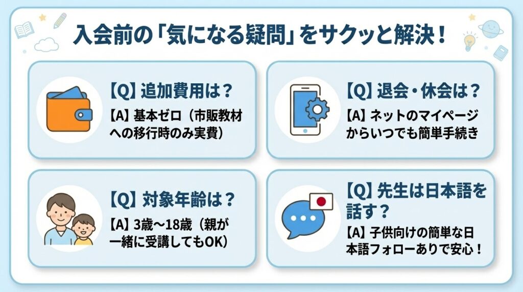 入会前にこれらの疑問を解消して、安心して無料体験に進んでくださいね。
